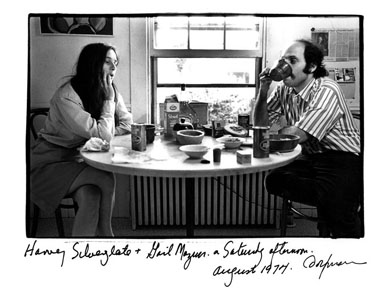 The next time we saw each other was February 1968 when Allen Ginsberg came to read for the Harvard SDS chapter. Allen was all involved in legislation to legalize marijuana, and wanted to compare notes with Harvey (whom he'd heard about from several people], so we called Harvey at one in the morning to come to the party we were at. The next week, Harvey came to my house for supper. He was two hours late and brought me a Wetzstein's New York kosher salami that was twenty-seven inches long. I made a roast beef -- rare -- and fresh mushrooms; Harvey didn't tell me that he can't stand either red meat or vegetables. Since then, we've been together and broken up several times.