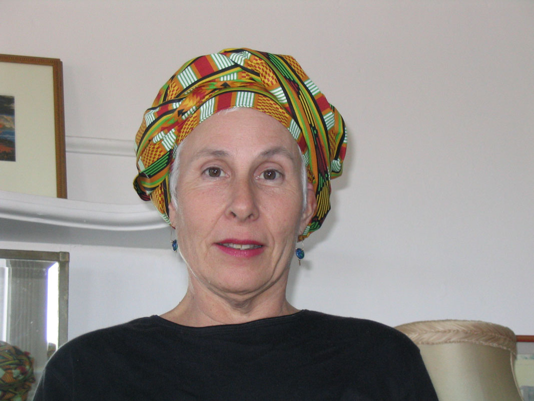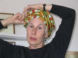 Nancy: One Sunday morning this past July, I was working at a garden around the corner from Elsa's house when I spotted her coming down the streeet. I had just received an invitation to the publication party for "No Hair Day" so when she approached, I doffed my baseball cap and said: "If you're planning a sequel to No Hair Day, can I be in it?". We hadn't seen each other for several months so she didn't know that I had had breast cancer and had recently finished chemotherapy. She was stunned and told me how sorry she was. Then she looked at me thoughtfully for a few moments and said, "this is great!". Now THAT was a reaction I hadn't heard. She told me about the turban project and her search for everything from a pattern to a post-chemo model. I wanted to help her and Patty with this project first of all because Elsa's enthusiasm is impossible to resist and let's face it, how many offers does a 55-year bald woman get to be a model?