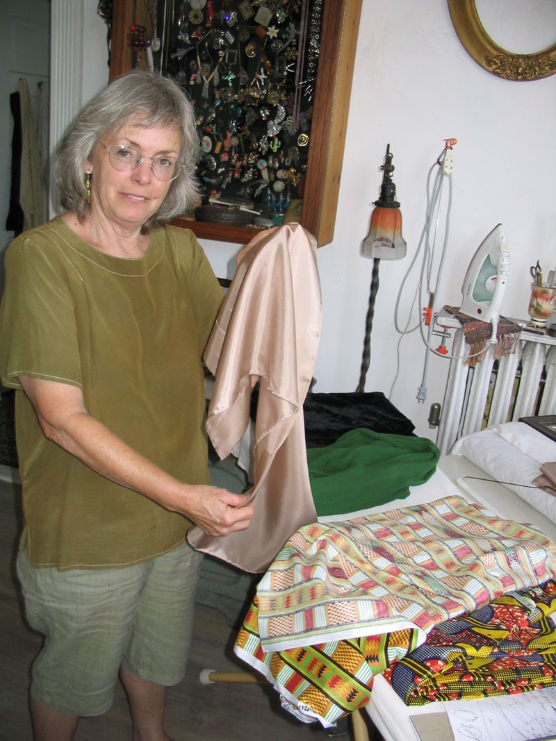My friend Patty Curran has a kind of rare genius that she says comes from her mother. She can paint. She can sew. She can see how things will look good together. The things can be furniture or clothes or tiles. She can make murals. In her house she has Joseph Cornell arrangements w/o ever studying Joseph Cornell. She makes my husband's ties and my dresses. She looked at the turban patterns I had bought on Ebay and sd, I can do better w/o a pattern. While Patty and I were in the talking stage, and wondering where we wd find a woman w/ cancer who wd be game to learn how to put on turbans, I ran into Nancy Forbes, tending a garden in my neighborhood. Alas, Nancy had breast cancer. And Kyle Nicholls was a friend from ArsDigita days who has become my new webmaster and compatriot in things cyber.