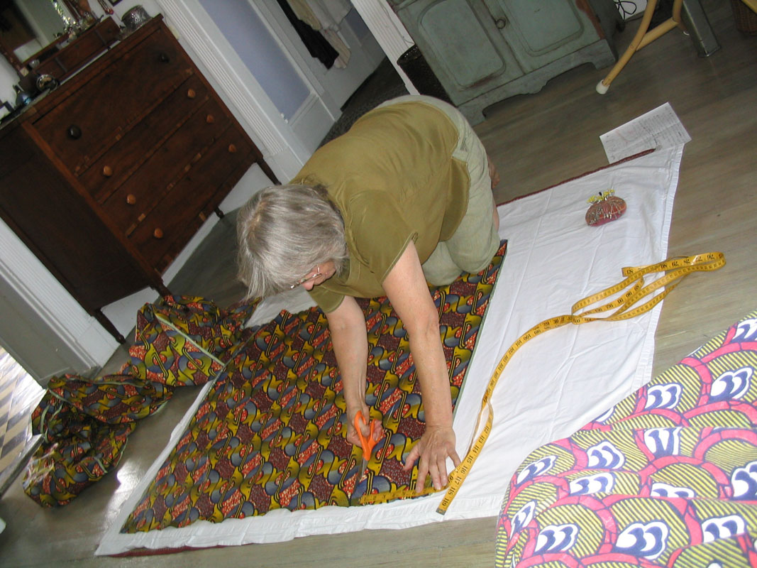 We went to SewLow in East Cambridge, MA. It is a great great old fashioned place that the owner Chuck has managed to keep going by being adaptive to people's preferences. Suzanne has worked there for years. Patty decided to go w/ medium weight crisp cotton because it will have enuf body to hold itself together when it is wrapped. We bought two African prints in medium cotton. We are making a long turban and a square turban. Patty's style is to cut ALL the needed cloth for BOTH turbans first. She says if you cut and sew one turban and then cut and sew the second turban, you are quote all tediumed out and are likely to make more mistakes!!!!! And she is an expert.