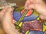 Here's Patty starting at the narrow end of the long turban. Notice that the material is inside out. |