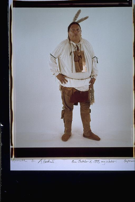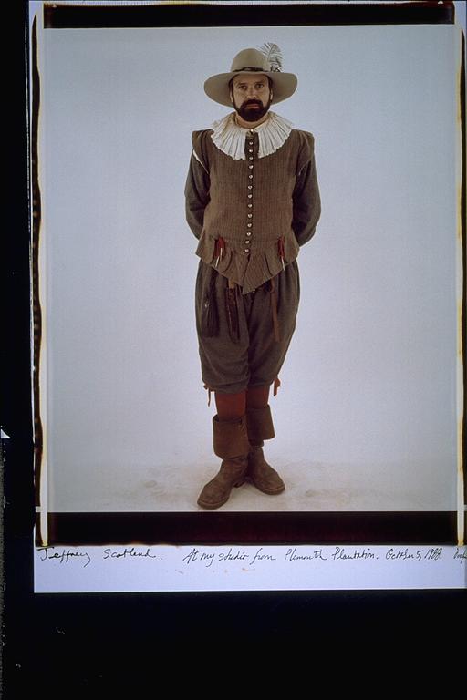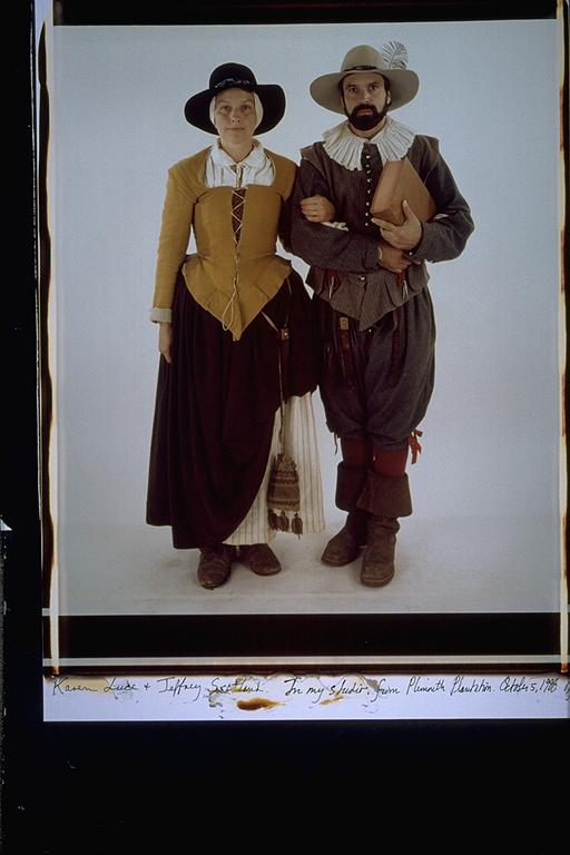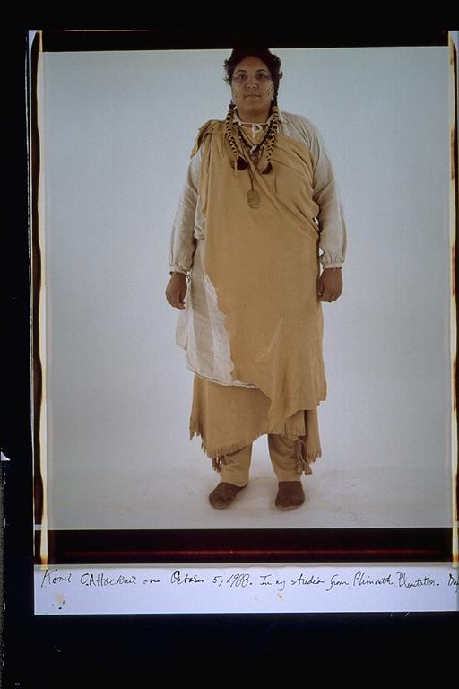 On October 5, 1988 I was invited by Jay Veevers who managed the public programs at The Mall at Chestnut Hill, in Chestnut Hill, MA to make portraits of actors and members of the Wampanoag tribe who worked at Plimouth Plantation, by the Plymouth Rock where the Pilgrims landed. Their job at Plimouth Plantation is to sound and look like we think the Pilgrims and Indians looked in 1627 and to walk around and do tasks in the replica village. The Mall actually replicated parts of Plimoth Plantation in celebration of Thanksgiving and my portraits were part of the display.