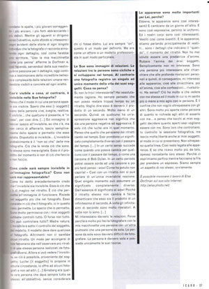 4. Le apparenze sono molto importanti per lei. Perchi? Ebbene, le apparenze sono cosl interessanti! E cambiano da un giorno all'altro. E sono cosl espressive, persino le uniformi. Ed i nostri corpi sono cosl interessanti. Vestiti cosi come svestiti. E le apparenze, stiamo parlando principalmente di vestitisono i dettagli che indicano il "quando", il momento del ritratto. Non ho mai voluto essere una predatrice d'anime. Rubare l'anima dei miei soggetti. Semplicemente non mi interessa. Sono una persona piy interessata alle chiacchiere che alle profonde rivelazioni personali e quindi, di conseguenza, mi interesso alle apparenze, cioh alle chiacchiere, poi all'anima, cioh alle confessioni rivelazioni. Ha senso? Cir ha molto a che vedere con me stessa ed il modo in cui io mi sento piy o meno a mio agio con le persone. H il confine che non voglio oltrepassare con gli altri. Sono molto piy aperta come persona di quanto io richieda agli altri di esserlo con me e penso che tocchi ai miei soggetti decidere quanto aperti essi vogliano essere con me. Sono loro che controllano. Io controllo la sessione fotografica ma lascio molto libert` anche a miei soggetti, al modo in cui si presentano. Non oltrepasso quella linea. Cosl resto legata alle apparenze. E so che ricevo molto piy da loro, spesso nonostante loro stessi. Perchi ci esprimiamo perfino mentre facciamo la fila per prendere un espresso. Siamo sempre un aspetto di noi stessi, ovviamente.