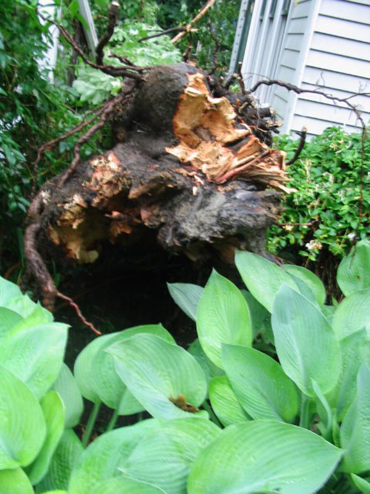 An email from our new tenant!!! Six oclock on a summer week day. The assumption that of course we wd be at our computers. No cell fone. No land fone. Too dangerous to run outside yelling. Correct of course abt the computers. This is how we found out that the sixty foot, eighty year old sugar maple tree in our backyard had been whipsawed by gale winds and come crashing down from its base or had been hit by lightening. Either way, the tree was down. Inside, abt twenty yards away I didn't hear a thing, mostly because the rain and thunder were so loud.
